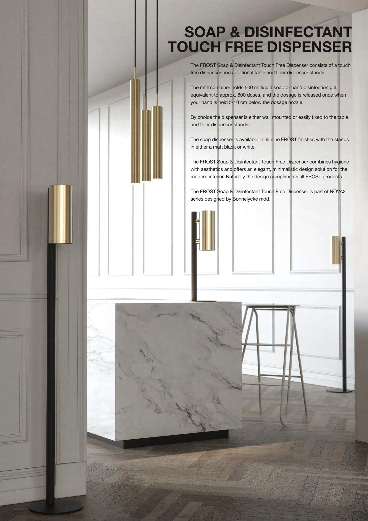 Der Nova Desinfektionsspender von Frost Denmark überzeugt nicht nur auf funktionaler Ebene, sondern punktet besonders mit seiner modernen und stilvollen Ästhetik. Der von Bønnelycke MDD designte Nova Desinfektionsspender ist für häufig besuchte Räume wie Empfangs- und Wartebereiche oder Konferenzsäle optimal.