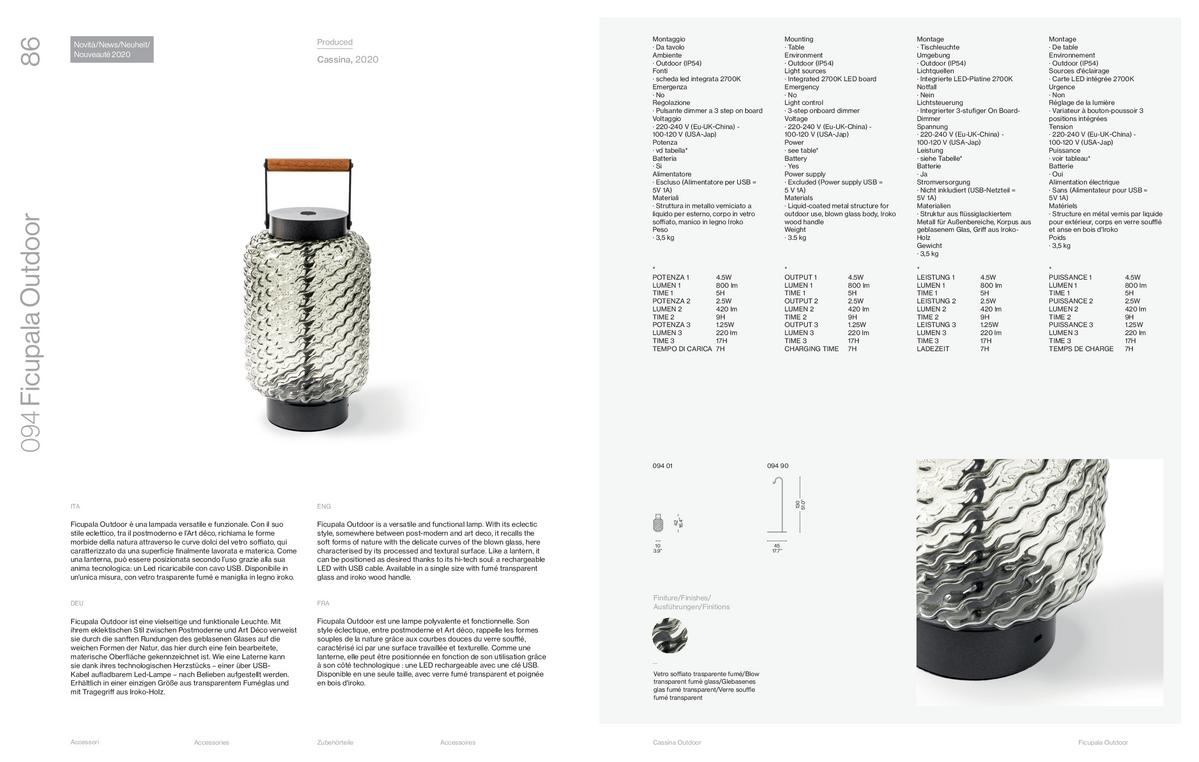 Die Ficupala Outdoor Leuchte von Cassina schafft mit der Wellenform des mundgeblasenen Fuméglases und dem Tragegriff aus Irokoholz eine natürliche Verbindung zwischen In- und Outdoor. Wie eine Laterne kann sie bequem umgestellt und mitgenommen werden und ist über USB unkompliziert aufladbar.