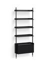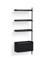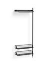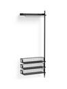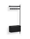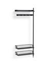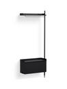 | Material | Regalböden: Stahlblech, schwarz pulverbeschichtet Stangenaufhängung: Stahl, verchromt Garderobenstange: Aluminium, stanggepresst mit Knaufen aus Aluminiumdruckguss Drahtkorb: Stahlstab und -draht, schwarz pulverbeschichtet Schrank: Stahlblech, schwarz pulverbeschichtet mit Tür aus Aluminium mit Magnetverschluss Verbinder: Aluminium Säulen: Aluminium, schwarz eloxiert mit satinierter Oberfläche und Endkappe/Gleiter aus Kunststoff |