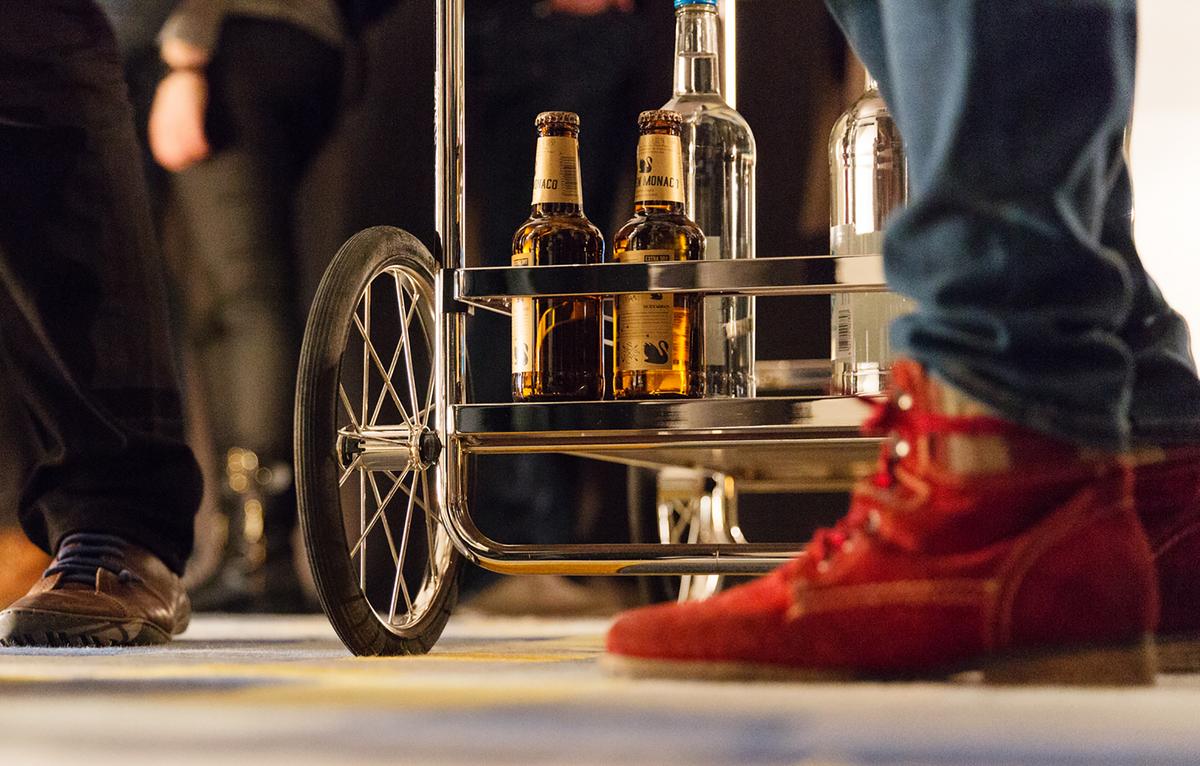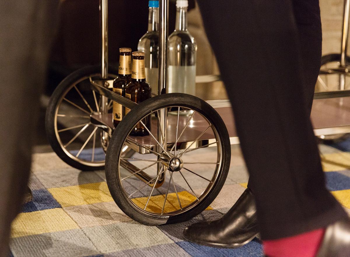 Ein optionaler Flaschenhalter sorgt für zusätzliche Sicherheit in der mobilen Minibar. Die in das Gestell aus vernickeltem Stahlrohr eingelassen Platten sind zudem in unterschiedlichen Ausführungen erhältlich.