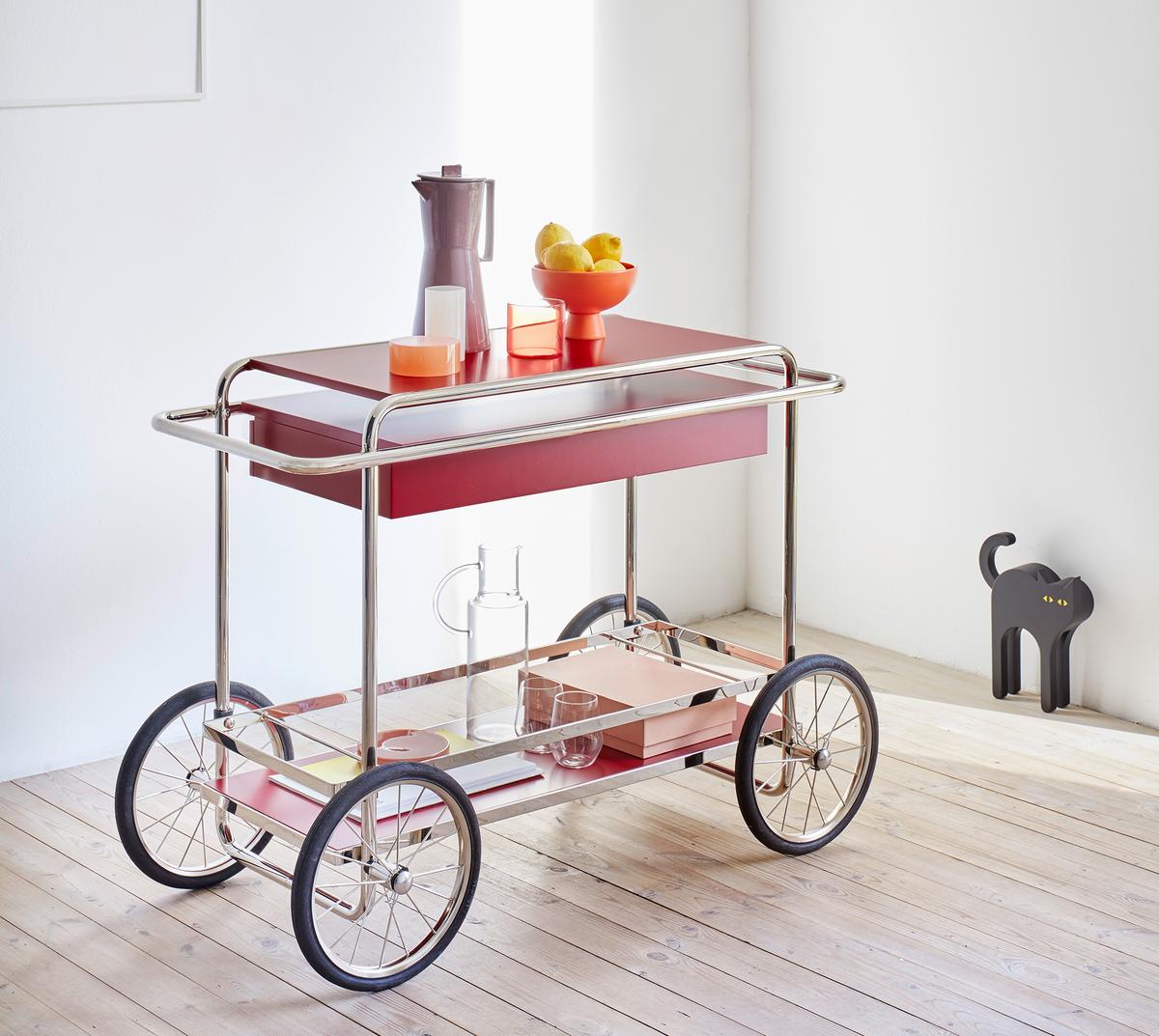 Der auf Bauhaus-Design spezialisierte Hersteller Tecta liefert mit dem Konsolwagen M4RS ein Stück für echte Designliebhaber. Der elegante Servierwagen ist in Anlehnung an Bauhausklassiker aus dem Tecta Portfolio entstanden: der Entwurf verbindet die großen Speichenrädern der Bauhausliege F41-E mit dem elegant gebogenen Gestell des Bauhaus-Couchtischs M40 und der praktischen Schublade des Oblique-Schreibtischs K2D aus dem Jahr 2007. So wurde der M4RS von Tecta ganz im Sinne des Bauhaus Designers Marcel Breuer gestaltet und bietet mit viel Eleganz und einem Hauch Nostalgie alles, worauf es bei einem funktionalen Servierwagen ankommt. Ob Geschirr, Flaschen, Zubehör oder auch Bücher - der Tecta Konsolwagen hält auf zwei Etagen ausreichend Platz zum Servieren oder für ein mobiles Bücherregal bereit. Dabei kann der Servierwagen problemlos an dem gebogenen Stahlrundlauf von allen Seiten verschoben werden. Für zusätzliche Sicherheit in der mobilen Minibar sorgt ein optionaler Flaschenhalter. Die Platten und Schubladenelemente des M4RS sind in unterschiedlichen Ausführungen erhältlich.