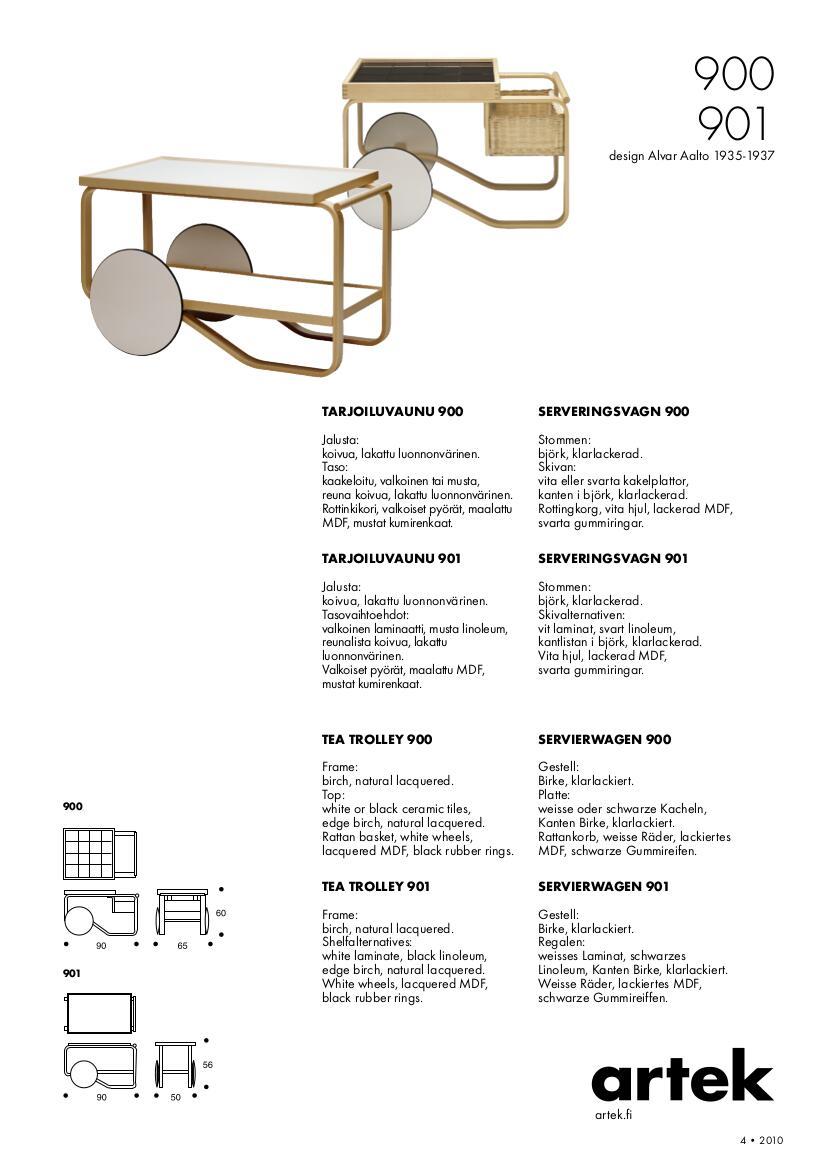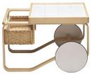 1937 von Alvar Aalto designt, gehört der Servierwagen 900 zu einer ganzen Kollektion von Holzmöbeln, die der Architekt und Designer in dieser Zeit kreierte. Viele der Produkte des Finnen werden heute von dem Möbelhersteller Artek produziert und vertrieben, so auch der außergewöhnliche Servierwagen 900. Ganz in finnischer Handwerkstradition, besteht der Haushaltshelfer aus Birkenholz und funktioniert nicht nur tatsächlich fürs Servieren von Speisen oder Getränken, sondern macht dabei auch noch eine ausgesprochen gute Figur. Denn neben seiner großen weißen Räder hält der Servierwagen außerdem eine hochwertig gekachelte Ablagefläche und einen dekorativen Rattankorb bereit. So muss man den Wagen keinesfalls verstecken, wenn es einmal nichts zu servieren gibt, denn er wirkt genauso stilsicher im Wohn- oder Küchenbereich als Stammplatz für Accessoires oder Topfpflanzen.