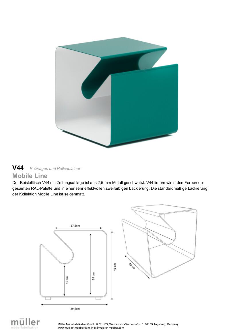 Der V44 Beistelltisch von Delphin Design gehört zur Produktserie Mobile Line des Herstellers Müller Möbelfabrikation und kann als Couchtisch auf Gleitern oder als Rollwagen sowie Rollcontainer genutzt werden. Der in Augsburg ansässige Möbelhersteller ist besonders für die Produktion von individuellen Designermöbeln aus Metall bekannt und fertigt seine komplette Produktpalette im Werk in der bayrischen Stadt. Handgeschweißt aus 2,5 mm starkem Stahlblech und mit einer klaren Formensprache, harmonischen Rundungen und solidem Material glänzt das Designermöbel von Müller Möbelfabrikation durch industriellen Charme. In die Tischplatte ist ein schräg verlaufendes Fach eingelassen, das Platz für Magazine und Zeitungen bietet und einen individuellen Blickfang darstellt. Als besonderes Highlight kann der V44 Beistelltisch gemäß der 213 Farbtöne umfassenden RAL Classic Serie farblich individuell konfiguriert werden. Auf Wunsch besteht auch die Möglichkeit, die Innen- und die Außenfläche in unterschiedlichen Farbtönen anfertigen zu lassen.