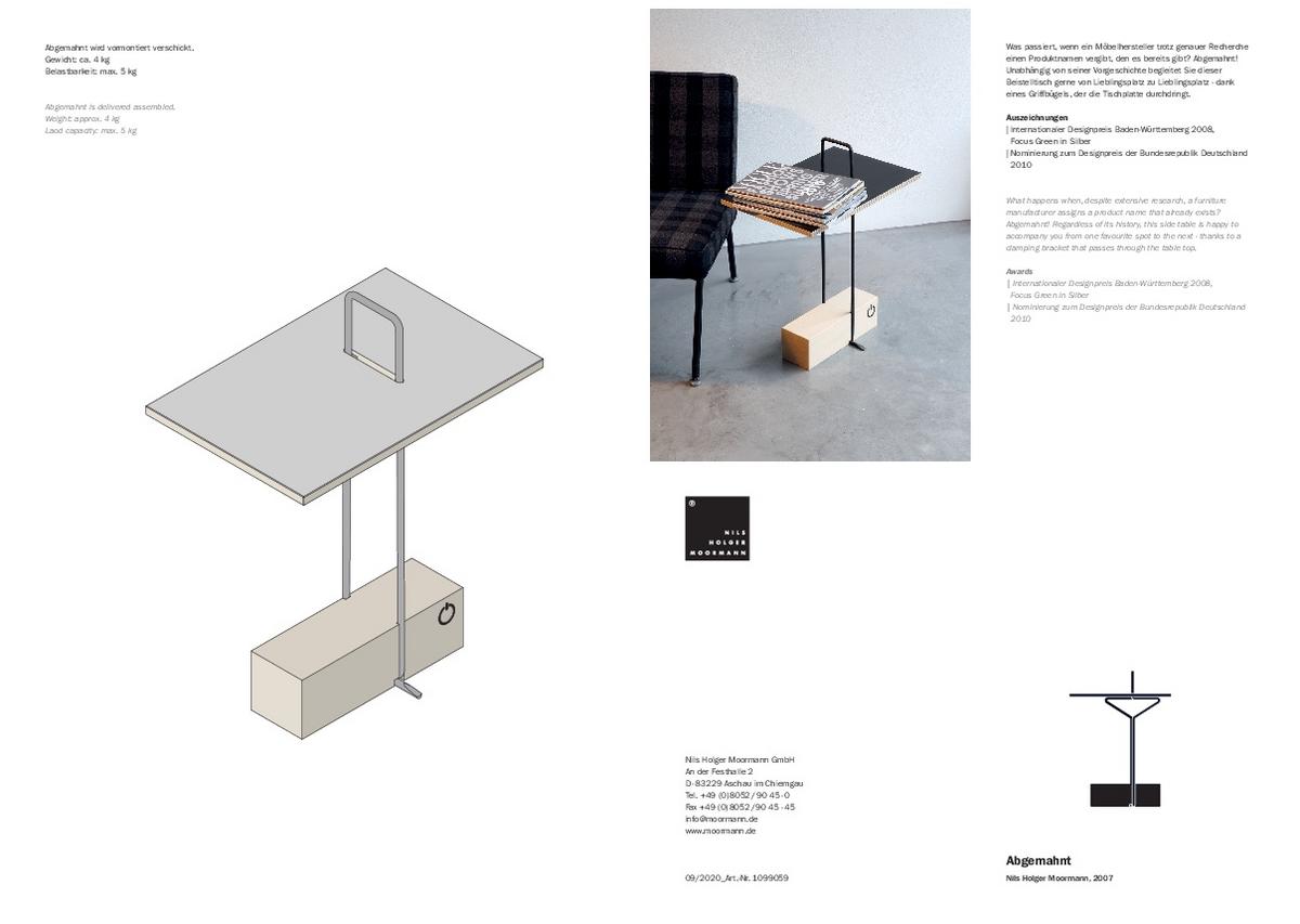 Abgemahnt von Nils Holger Moormann bricht mit der konventionellen Form eines Beistelltischs und überzeugt mit seinem hochwertigen Materialmix und seinem reduzierten, klar definierten Look als erfrischende Variante des Beistellmöbels. Den Fuß des Tisches bildet ein Sockel aus massiver Fichte, der an zwei Seiten von einem Gestell aus warmgewalztem Rundstahl umschlossen wird, das sich in die Höhe erstreckt, dort als Basis für die Tischplatte dient und diese durchstößt, um schließlich in einem Griff zu enden. Dieser befindet sich allerdings nicht in der Mitte der Tischplatte, sondern ist etwas versetzt, sodass der unkonventionelle Beistelltisch noch einmal an Besonderheit gewinnt. Als kleines Detail befindet sich auf einer Seite des Sockels das Stand-by-Symbol - seines Zeichens eigentlicher Namensgeber für den Tisch. Ein anderer Hersteller hatte damals jedoch bereits einen Beistelltisch unter diesem Namen im Programm. Er kam Moormann mit einer juristischen Abmahnung in die Quere, doch Moormann reagierte mit gewohnter Cleverness und nutzte den Vorfall einfach für sein Produkt, das fortan Abgemahnt heißen sollte.