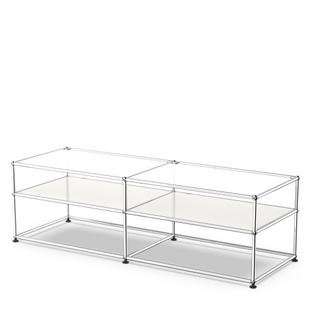 Das USM Möbelbausystem Haller bietet die Möglichkeit, ein Möbel nach individuellen Bedürfnissen zu gestalten und jederzeit umzubauen oder zu erweitern. Dabei gehören die beliebten Beistelltische zwar eher zu den Kleinmöbeln, stehen aber den Sideboards und Regalen in der Gestaltungsvielfalt in nichts nach. So ist der USM Haller Beistelltisch Typ I wahlweise mit Metall-, Glas- oder lackierten Glastablaren erhältlich. Durch die offene Struktur wirkt der Beistelltisch elegant und zeitlos zugleich und bietet dennoch genügend Ablagefläche für Bücher, Vasen und Gläser.