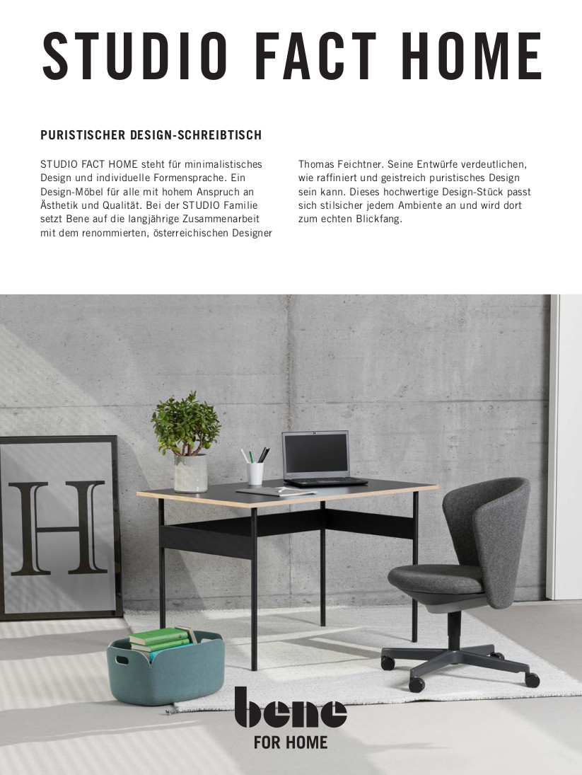 Bene bietet mit dem Studio Fact Schreibtisch ein minimalistisches Möbel für das individuelle Home Office. Designer Thomas Feichtner steht für puristische, funktionale Entwürfe, sein Home Office Schreibtisch fügt sich stilsicher in seine Umgebung ein.