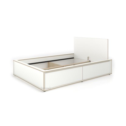 Spaze vom Designstudio Kaschkasch ist das neueste Mitglied der Bettenserie von Müller Small Living. Mit seiner minimalistischen Linie fügt es sich in verschiedenste Umgebungen ein und bietet mit seinen geräumigen Schubladen jede Menge Stauraum. Rahmen und Kopfteil bestehen aus Birken-Multiplexplatten, die mit einer Melaminharzbeschichtung versehen sind. Die naturbelassenen, geölten Kanten bilden einen harmonischen Kontrast.