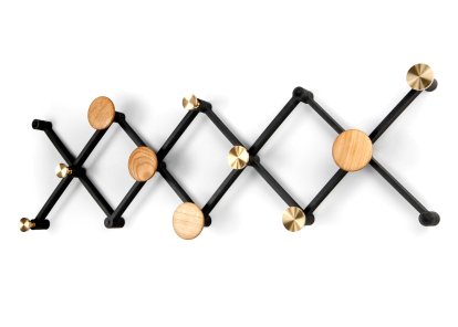 Die X-Tend Garderobenleiste von Loca wurde vom dänischen Designer Thomas Pedersen entworfen und bietet dank ihrer flexibel verknüpfbaren Streben unzählige Variationsmöglichkeiten. Die Holz- und Messinghaken fungieren nicht nur als Aufhänger, sondern bieten gleichzeitig einen tollen Materialkontrast und Blickfang.