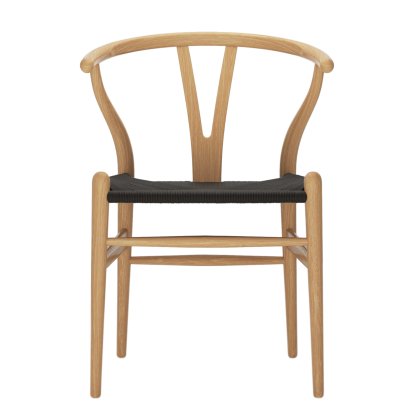 Der wohl bekannteste Entwurf Hans J. Wegners ist der auch als Y-Chair bekannte CH24 Wishbone Chair, vertrieben vom dänischen Hersteller Carl Hansen & Søn. Das Besondere steckt hier in den formalen und materiellen Details: Während Rücken und Gestell in den Armlehnen so zusammenlaufen, dass eine einzigartige formale Ausgewogenheit entsteht, sind in der Sitzfläche des aus Massivholz gefertigten Stuhls 120 Meter Papiergarn verarbeitet.