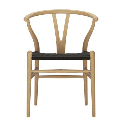 Der wohl bekannteste Entwurf Hans J. Wegners ist der auch als Y-Chair bekannte CH24 Wishbone Chair, vertrieben vom dänischen Hersteller Carl Hansen & Søn. Das Besondere steckt hier in den formalen und materiellen Details: Während Rücken und Gestell in den Armlehnen so zusammenlaufen, dass eine einzigartige formale Ausgewogenheit entsteht, sind in der Sitzfläche des aus Massivholz gefertigten Stuhls 120 Meter Papiergarn verarbeitet.