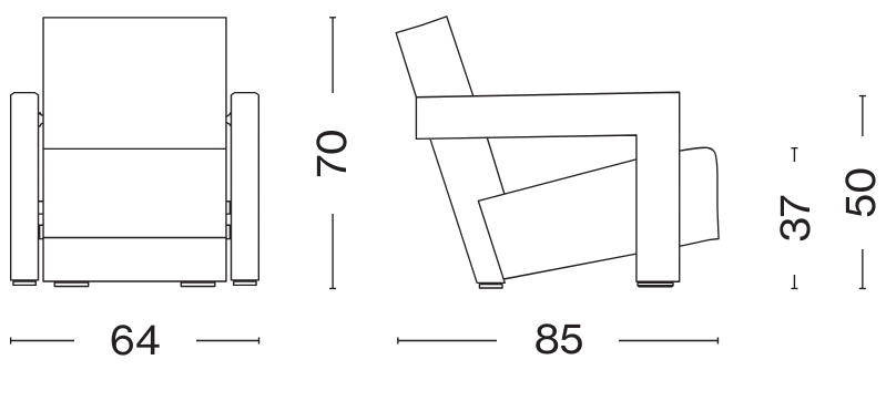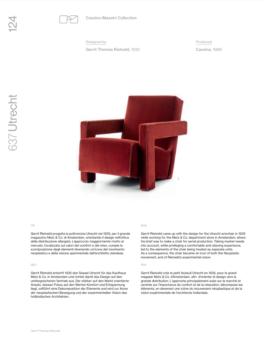 Der Utrecht Sessel von Cassina spiegelt die Vision des niederländischen De-Stijl-Architekten Gerrit T. Rietveld wieder: um einen bequemen, hochwertigen, aber einfach zu produzierenden Sessel zu bauen, wird das Möbel in seine Einzelteile zerlegt. Die Armlehnen, Sitz- und Rückenfläche stehen in ihrer für Rietveld typischen geometrischen Charakteristik ganz für sich.