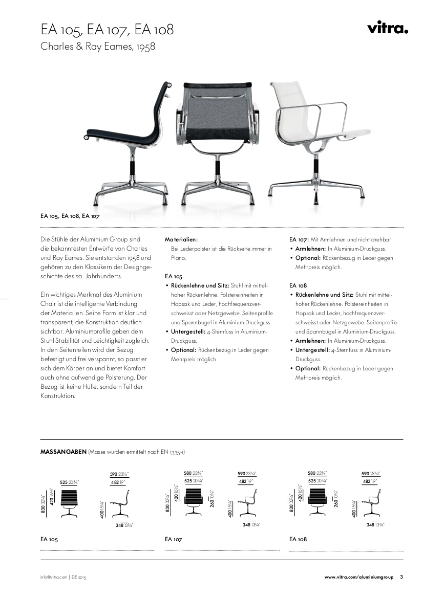 Der EA 105 gehört zur Gruppe der Aluminium Chairs, die Charles und Ray Eames 1958 designten und die heute vom Schweizer Möbelunternehmen Vitra hergestellt werden. Er ähnelt der Gestalt des Vitra Stuhls EA 101, ist jedoch in alle Richtungen etwas größer, wodurch er sich perfekt für die Bestuhlung von Meeting- und Konferenzräumen eignet, wo er eine stilvolle und zugleich bequeme Sitzgelegenheit bietet. Außerdem passt der Alu Chair EA 105 dank der umfangreichen Farbpalette, die Vitra für den Bezugsstoff anbietet, in so gut wie jedes Firmenkonzept oder Gestaltungsprinzip.