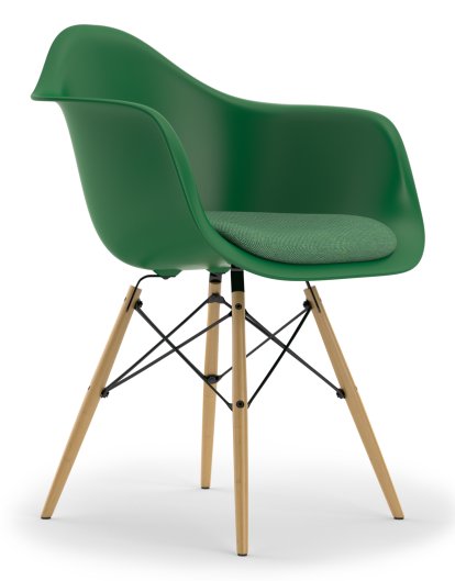 Eames Plastic Armchair RE DAW, Smaragd, Mit Sitzpolster, Grün / elfenbein, Standardhöhe - 43 cm, Ahorn gelblich