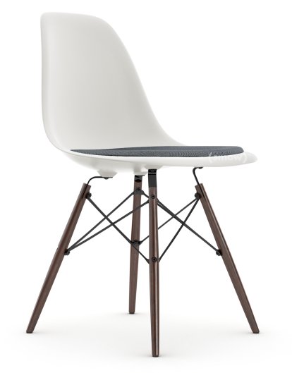 Eames Plastic Side Chair RE DSW, Weiß non-RE, Mit Sitzpolster, Dunkelblau / elfenbein, Standardhöhe - 43 cm, Ahorn dunkel