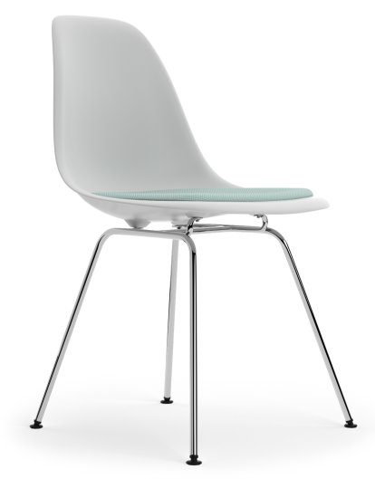 Eames Plastic Side Chair RE DSX Cotton white|Mit Sitzpolster|Eisblau / elfenbein|Standardhöhe - 43 cm|Verchromt