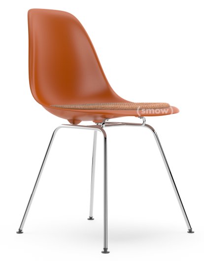 Eames Plastic Side Chair RE DSX, Rostorange, Mit Sitzpolster, Cognac / elfenbein, Standardhöhe - 43 cm, Verchromt