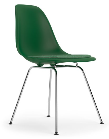 Eames Plastic Side Chair RE DSX Smaragd|Mit Sitzpolster|Grün / elfenbein|Standardhöhe - 43 cm|Verchromt