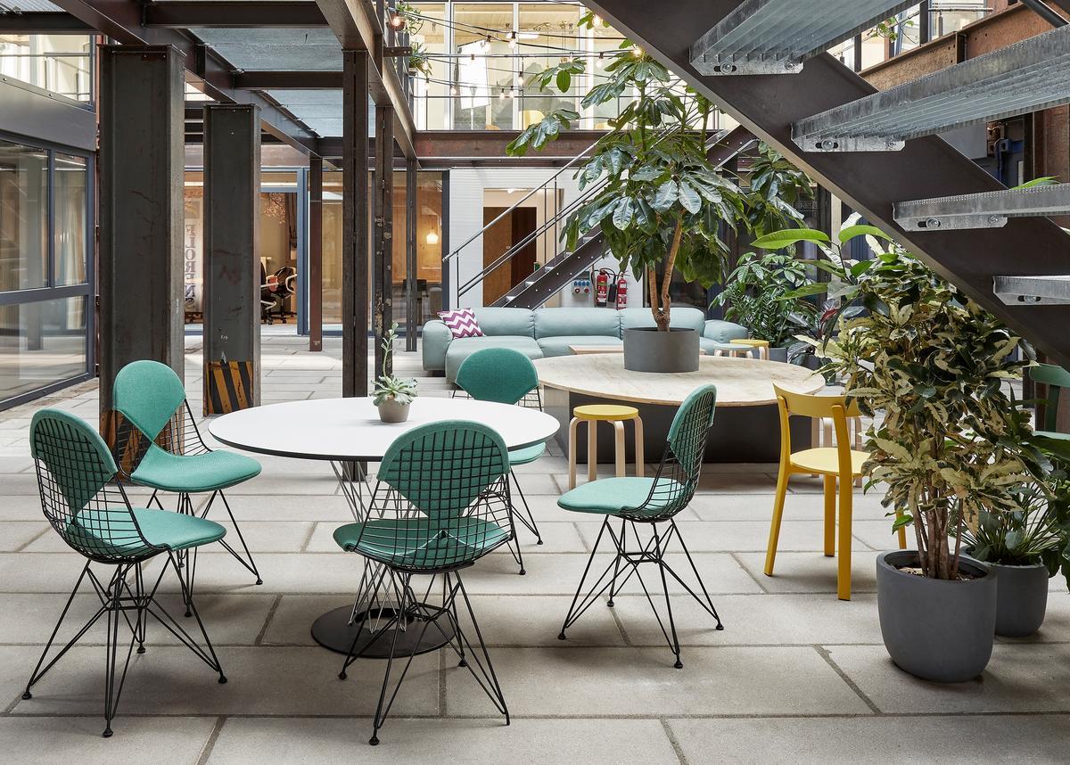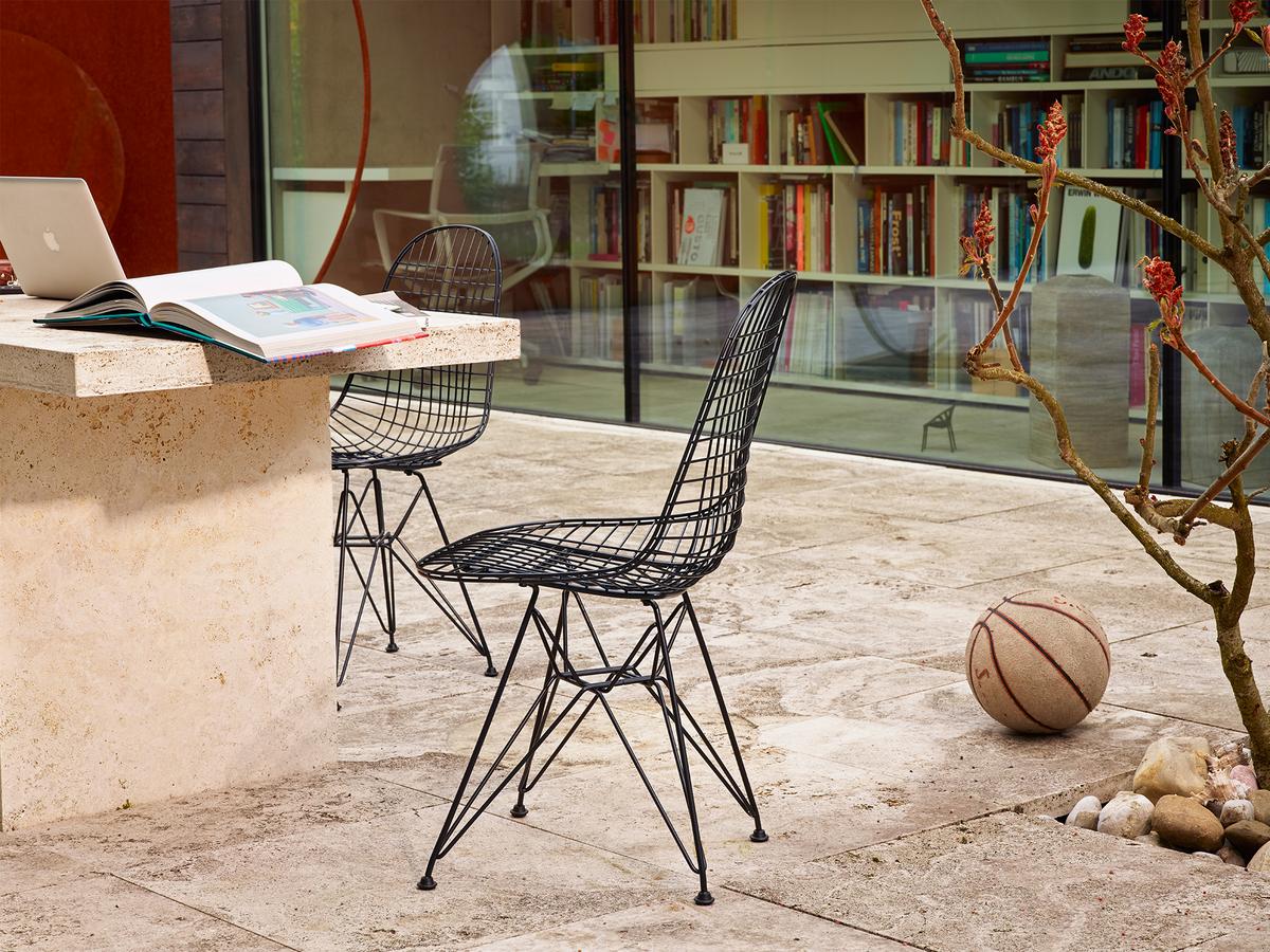 Die Eames Wire Chairs wurden 1951 vom amerikanischen Möbelhersteller Hermann Miller eingeführt. Zwar ähnelt die Form der Sitzschale den Eames Plastic Chairs, allerdings wird für die Kollektion aus Metall eine ganz andere Technologie verwendet. Statt aus Kunststoff besteht die Schale aus Stahldraht, der zusammengeschweißt ein robustes Netz mit einem durchbrochenen Muster bildet. Diese Transparenz verleiht dem Stuhl eine skulpturale, organische und leicht wirkende Form. Durch den Einsatz des elektrischen Widerstandsschweißens war der Vitra Stuhl für die damalige Zeit eine technologische Errungenschaft. Mit diesem Verfahren zur Metallverarbeitung, das bisher in der Automobil- und Luftfahrtindustrie eingesetzt wurde, erhielt Hermann Miller als erster ein Patent für industriell hergestellte Stühle. Die Schnelligkeit der Roboterausführung, die Qualität und die niedrigen Kosten ermöglichten die Markteinführung der Eames Wire Chairs Kollektion, die sofort ein internationaler Erfolg war. Seit 1958 produziert der europäische Hersteller Vitra die Wire Chairs nach dem gleichen Verfahren. Die Metallstäbe werden übereinandergelegt und unter Druck zwischen zwei Elektroden gehalten, bevor Strom hindurchfließt. Nach sehr kurzer Abkühlung des Schmelzpunktes können die Stäbe gelöst und dann miteinander verschweißt werden. Im Jahr 2016 erweiterte Vitra die ursprüngliche Höhe der Wire Chairs um 20 mm. Diese Änderung ist optisch nur wenig erkennbar, da das Design unverändert blieb. Allerdings ermöglichte die Anpassung eine komfortablere Sitzhöhe, da sich die Körpergröße der Menschen über die Jahrzehnte verändert hat und die Stühle sich nun auch besser mit verschiedenen Esstischen kombinieren lassen. Dank der Epoxidbeschichtung der Metallstruktur können einige Vitra Wire Chairs auch im Außenbereich eingesetzt werden.