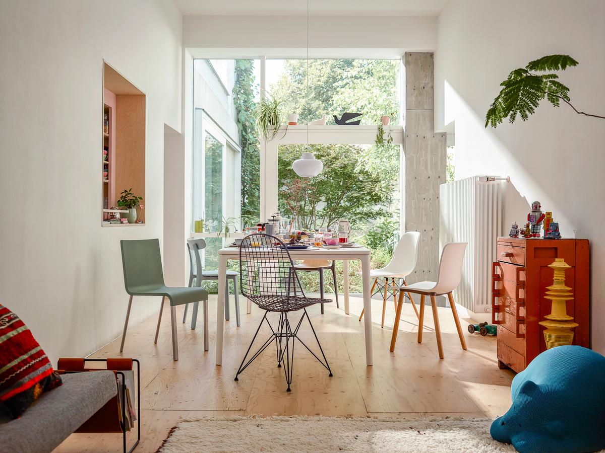 Die Vitra Wire Chairs von Charles und Ray Eames aus dem Jahr 1951 zitieren formal die Sitzschalen der Eames Plastic Chairs, die ein Jahr zuvor entworfen wurden, bestehen aber aus verschweißtem Stahldraht. Trotz der gleichen Form verkörpern die Wire Chairs einen ganz anderen Stil. Die Gitterstruktur und das glänzende Material verleihen den Vitra Stühlen eine elegante, luftige Silhouette. Für mehr Komfort sorgen das legendäre Bikini-Polster oder ein angenehmes Sitzkissen, das den Eames Stuhl harmonisch ergänzt. Während alle Vitra Wire Chairs dieselbe Sitzschale haben, weisen die Untergestelle Unterschiede auf. So verfügt der DKR Wire Chair über das skulpturale Eiffelturm-Gestell, der DKX über ein vierbeiniges Untergestell aus Stahlrohr und der Vitra DKW über ein Holzgestell. Mit dem DKR Wire Chair Outdoor aus Metall bietet Vitra auch eine Variante für den Außenbereich.