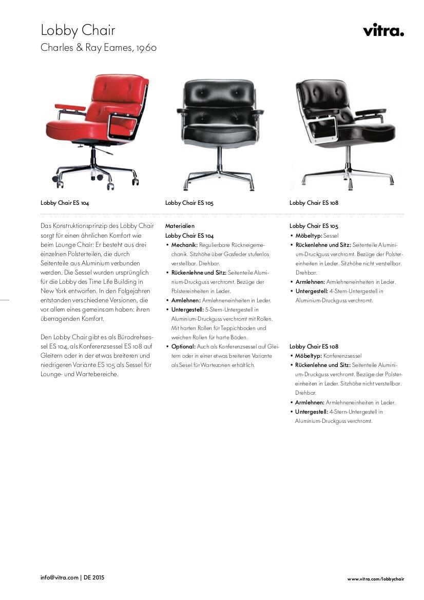 Der Eames Lobby Chair ES 105 / ES 108 entstand in einem Amerika, das, angestoßen vom wirtschaftlichen Aufschwung der Nachkriegsjahre, durch rasanten Fortschritt und das Aufkommen von Popkultur sowie einer zunehmenden Bedeutung des Konsums dominiert wurde. Neue Werkstoffe und Produktionstechniken ermöglichten es, Möbel in hohen Stückzahlen für breite Bevölkerungsschichten zu produzieren. Ray und Charles Eames leisteten in diesem Zusammenhang immer wieder Pionierarbeit, indem sie z. B. Materialien neu für das Möbeldesign interpretierten und neue Wege bei der Möbelproduktion einschlugen. Zudem wählten sie häufig Möbelserien als Mittel, um Anforderungen an flexible Bedingungen in modernen Wohn- und Arbeitsräumen gerecht zu werden. Auch der Vitra ES 105 entstand als kleine Serie. Den Eames Lobby Chair gibt es auch als ES 104 mit Rollen.