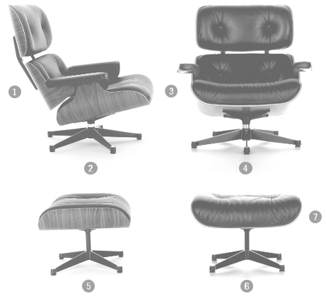 | Abmessungen | ![]() Lounge Chair (1) Höhe: 89 cm (2) Tiefe: 85 - 91 cm (3) Sitzhöhe: 38 cm (4) Breite: 84 cm Ottoman (5) Tiefe: 56 cm (6) Breite: 63 cm (7) Höhe: 42 cm |