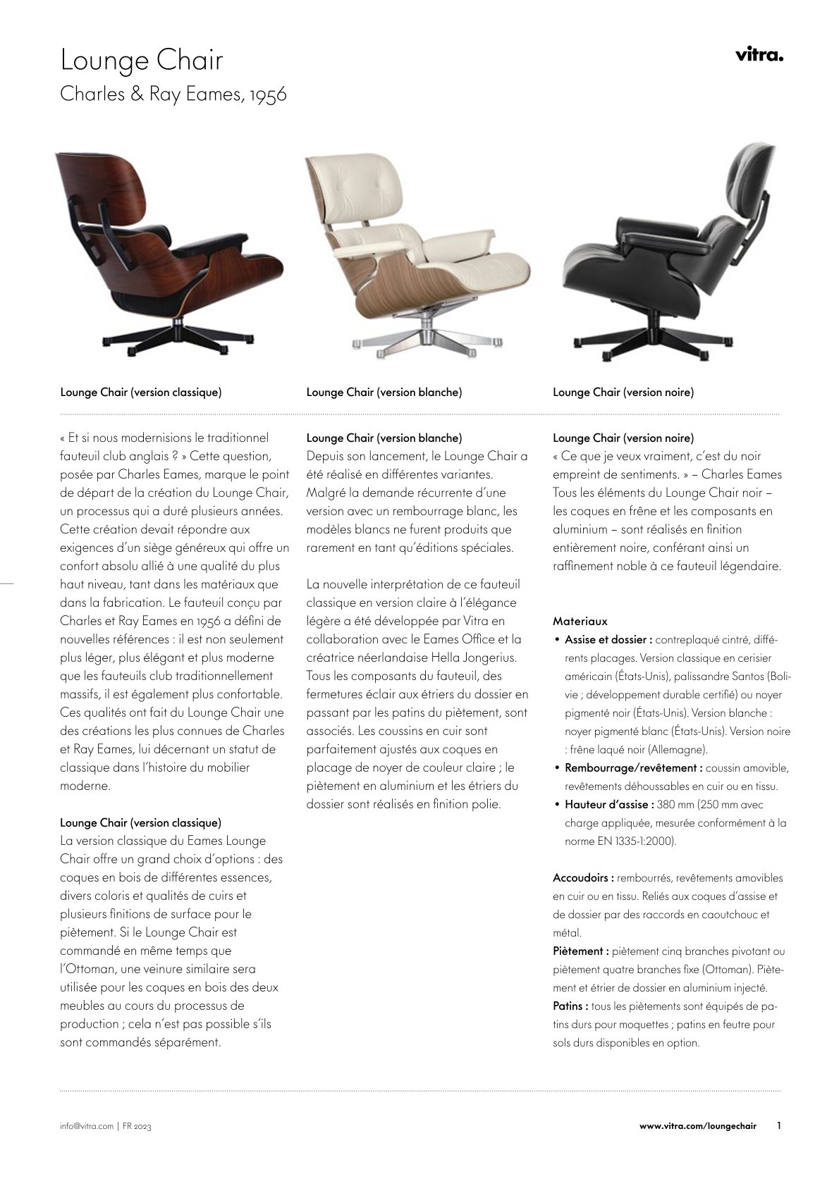 | Ausführungen | Lounge Chair in alter Höhe (84 cm) auf Anfrage erhältlich. Wahlweise mit Gleitern für Teppichböden oder Filzgleitern für harte Böden. |