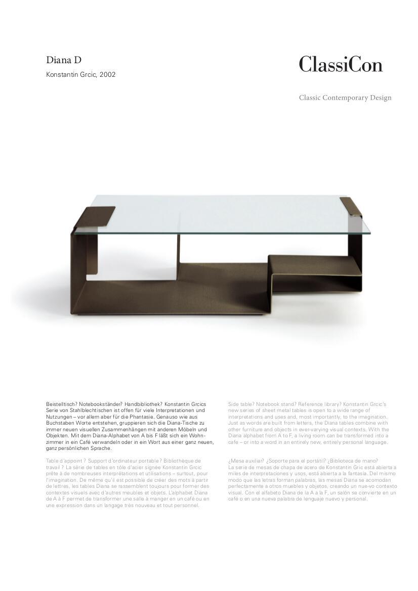 Mit dem Diana D Couchtisch von ClassiCon entwarf Konstantin Grcic einen besonders modernen, geradlinigen Vertreter seiner Gattung. Das Stahlblechgestell mit der eingefassten Tischplatte und die klaren Formen des ClassiCon Tisches überzeugen durch ihren industriell geprägten Charme.