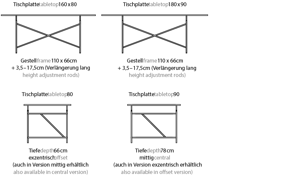 | Funktion & Eigenschaften | Höhenverstellbar um bis zu 17,5 cm Bei exzentrischer Verstrebung wird eine einseitige Benutzung empfohlen. Für die Nutzung als Esstisch empfehlen wir den Befestigungssatz als Ergänzung. Bei einer Blockstellung mehrerer Tische empfehlen wir den Niveauausgleichssatz. |