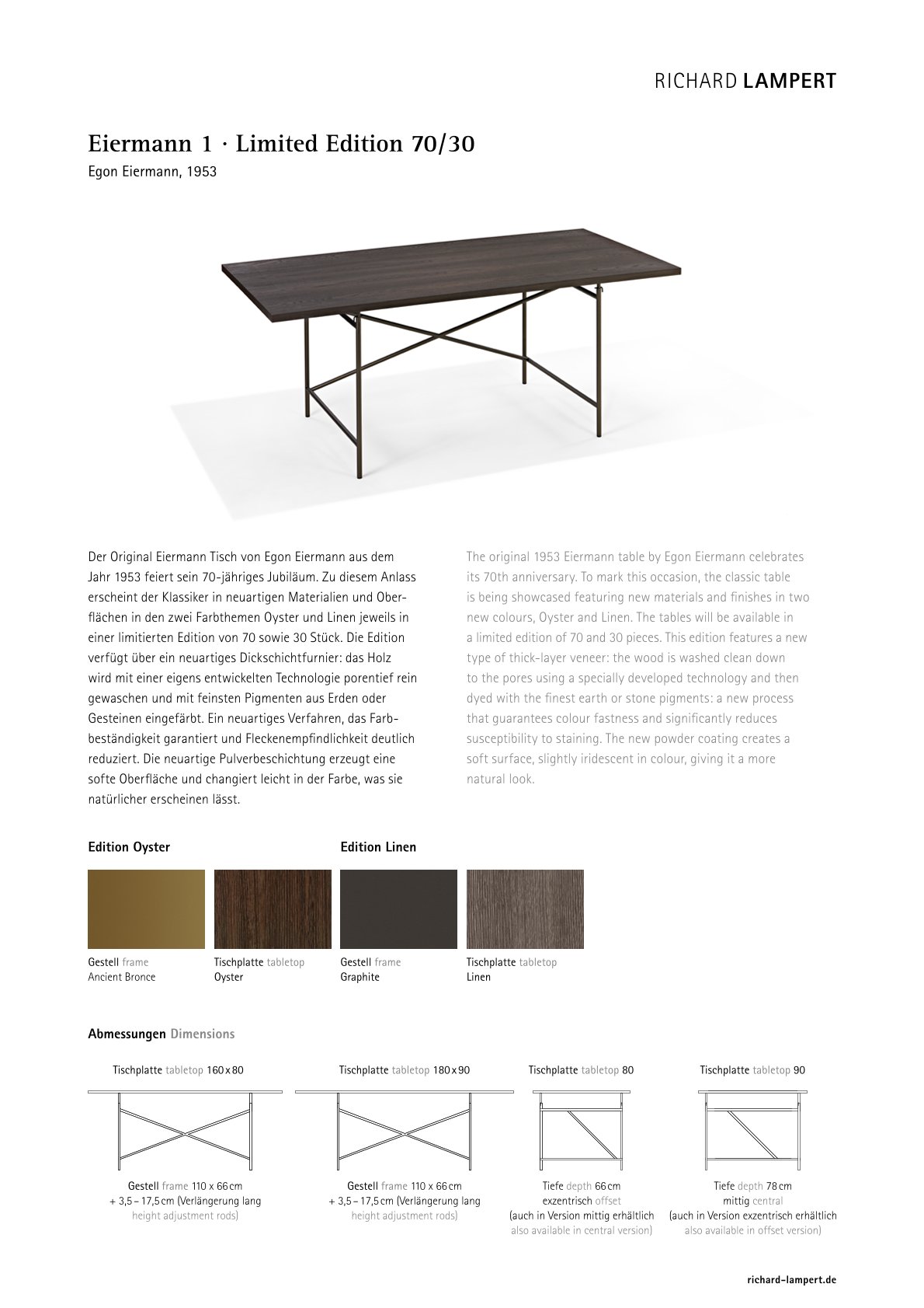 Zum 70. Geburtstag des Eiermann Tisches präsentiert Richard Lampert die limitierte Jubiläumsedition "70 Jahre Eiermann". Ein innovatives Produktionsverfahren schafft eine widerstandsfähige Tischplatte, die mit der soften Oberfläche des Eiermann Gestells in den natürlichen Farbtönen Oyster und Linen harmoniert. Ein einzigartiges Jubiläumsangebot eines zeitlosen Designklassikers, das auf Stückzahl limitiert ist.