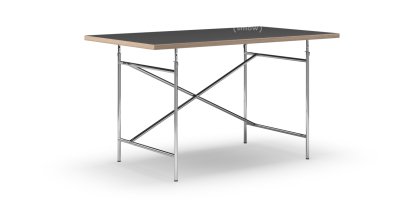 Eiermann Tisch, Linoleum schwarz (Forbo 4023) mit Eichekante, 140 x 80 cm, Chrom, senkrecht, versetzt (Eiermann 2), 100 x 66 cm