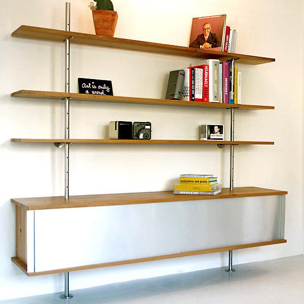 Die wenigen Originalregale von Eiermann aus den 1930er Jahren hatten 2000 mm Böden. Sie waren aus massiver Kiefer mit weiß lackierten Metallteilen.