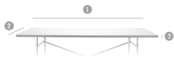 | Abmessungen | ![]() (1) Länge: 100 / 120 / 140 / 160 / 180 / 200 cm (2) Breite: 60 / 80 / 90 cm (3) Plattenstärke: 2,8 cm (Melamin), 3 cm (Linoleum), 2,5 cm (Eiche massiv) |