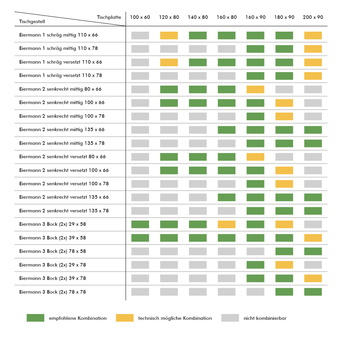 Aus den verschiedenen Formaten der Tischgestelle und Tischplatten ergeben sich zahlreiche - mehr oder weniger sinnvolle - Kombinationsmöglichkeiten. Es sollte unbedingt darauf geachtet werden, dass die Tischplatte ausreichend Überstand über die Auflagepunkte des Tischgestells hat. Zur Erleichterung der Auswahl einer geeigneten Variante für Ihre Zwecke soll nachfolgende Übersicht dienen. Die Kombinationsmöglichkeiten, die wir besonders empfehlen, sind grün hervorgehoben. Neben den aufgeführten rechteckigen Tischplatten werden auch gern runde Tischplatten genutzt z.B. in Verbindung mit dem Tischbock Eiermann 3. Wenn Sie bei der Auswahl unsicher sind, kontaktieren Sie bitte vor der Bestellung unseren Kundenservice, der Ihnen gern behilflich ist.