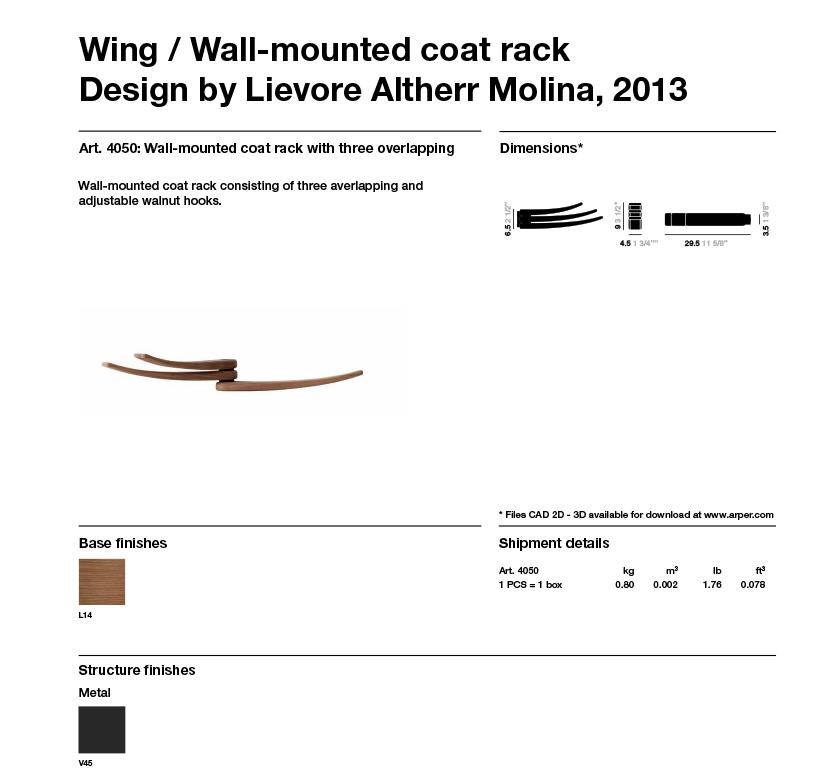 Die Wing Wandgarderobe von Arper wurde von Lievore Altherr Molina designt und punktet als platzsparende, elegante Aufbewahrungslösung für Jacken, Mäntel und Taschen. Die beweglichen und leicht gebogenen Arme verleihen der Arper Garderobe Funktionalität und Ästhetik.