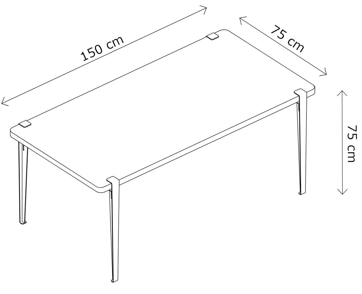 | Lieferumfang | 1 Tischplatte aus recyceltem Spanholz mit Eichenfurnier oder recyceltem Altholz in der Größe 150 x 75 cm 4 Tischbeine aus Stahl, Höhe 75 cm Ein Inbusschlüssel wird mitgeliefert. |
