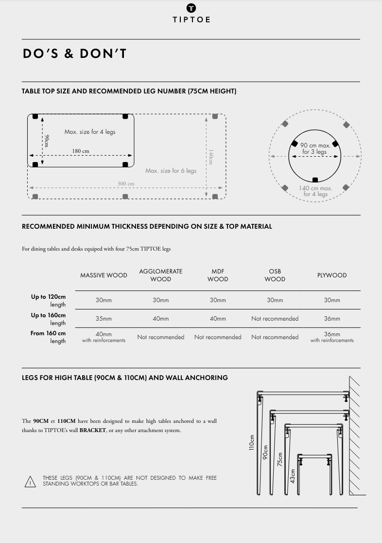 | Material | Tischplatte: Wahlweise Eichenfurnier oder recycelte Eiche. Seit 2019 bietet TIPTOE Möbel aus altem Holz an, das beim Rückbau von europäischen Gebäuden, wie z. B. alten Bauernhöfen oder Scheunen, gewonnen wird. Das Holz aus diesen zerstörten Gebäuden wird dann weiterverarbeitet, um ihm ein zweites Leben als Regal oder Tisch zu geben. Tischgestell: pulverbeschichteter Stahl |