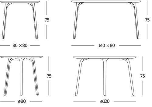 | Gewicht | Ø 80 cm: 9,7 kg Ø 120 cm: 24,3 kg 80 x 80 cm: 12,7 kg 140 x 80 cm: 23,8 kg |