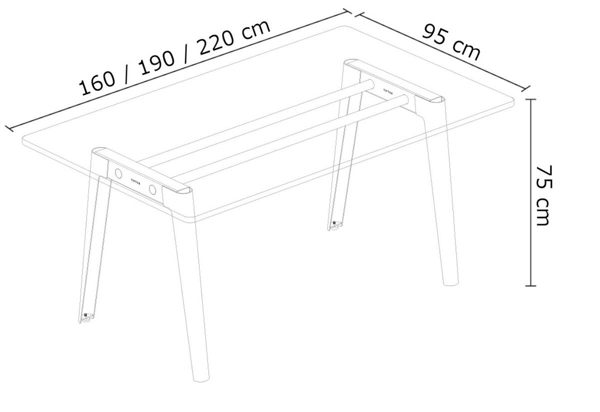 | Lieferumfang | 1 Holzplatte mit Eichenfurnier 2 Gestelle aus massiver Eiche 2 Stützbalken aus rostfreiem Stahl 1 bewegliche Querstrebe für die Variante mit 220 cm Verbindungsschrauben und Inbusschlüssel sind im Lieferumfang enthalten. |