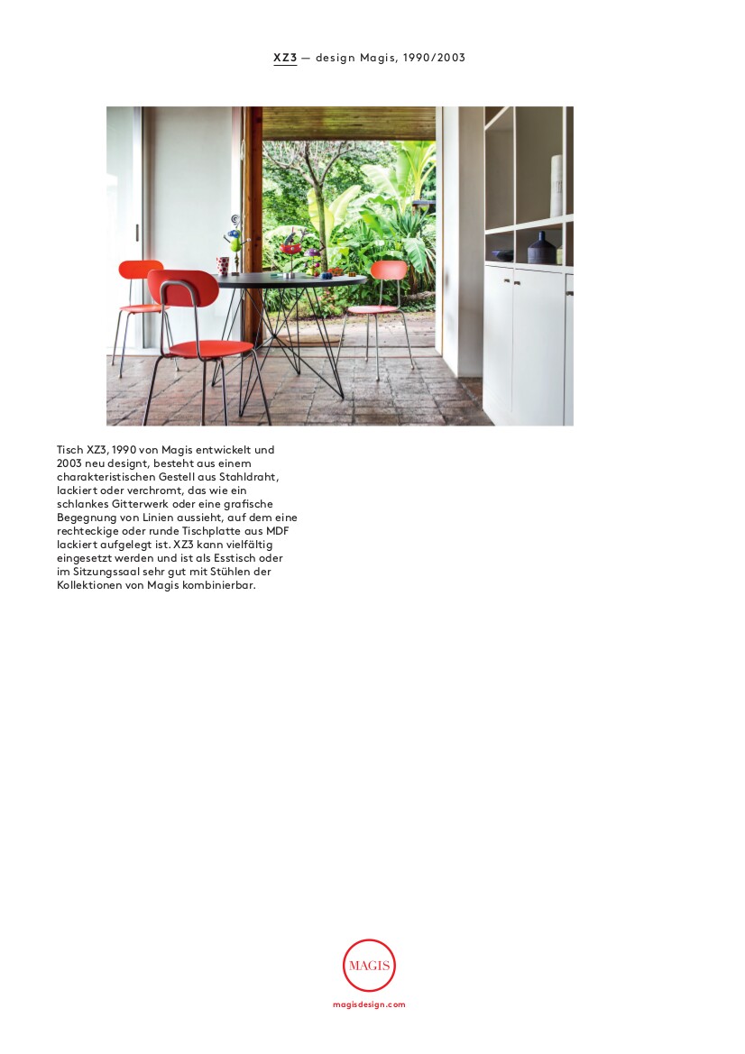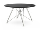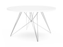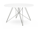 Der Tavolo XZ3 in runder Ausführung wurde im Jahr 2003 von Studio Tecnico für den italienischen Hersteller Magis entworfen. Charakteristisch bei diesem Esstisch ist das Tischgestell aus filigranen Metallverstrebungen, das ihn leicht und raffiniert wirken lässt. Optisch erinnert es an das Eiffel-Gestell der Eames Chairs mit denen sich der Tisch so auch harmonisch kombinieren lässt. Die Tischplatte aus MDF ist in eckiger oder in runder und entweder in schwarzer oder in weißer Ausführung erhältlich. Auch bei dem Tischgestell kann zwischen verschiedenen Farbvarianten gewählt werden, zur Auswahl stehen eine verchromte, eine weiß lackierte und eine schwarz lackierte Ausführung. Das Design steht dabei stellvertretend für das innovative Portfolio des italienischen Möbelherstellers Magis: Zukunftsgewandte Formen werden raffiniert mit minimalem Materialeinsatz umgesetzt und schaffen eingängige, bleibende Möbel, die bestens geeignet sind für ein anspruchsvolles modernes Interieur.