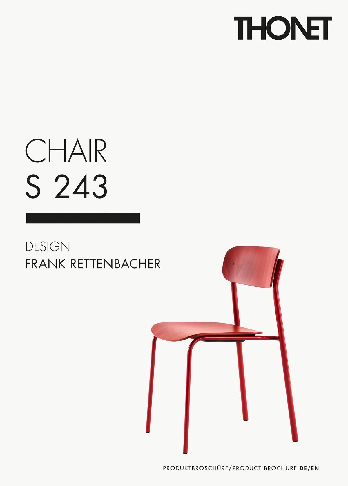 Mit dem S 243 Stuhl vereint Frank Rettenbacher Leichtigkeit neben Funktionalität im Design. Inspiriert durch die Klassiker von Thonet, den Freischwingern, besteht der Stuhl aus einem Stahlrohrgestell in Kombination mit Formholzteilen. Der S 243 ist in verschiedenen Farbkombinationen erhältlich, dazu stapelbar und lässt sich vielseitig einsetzen.