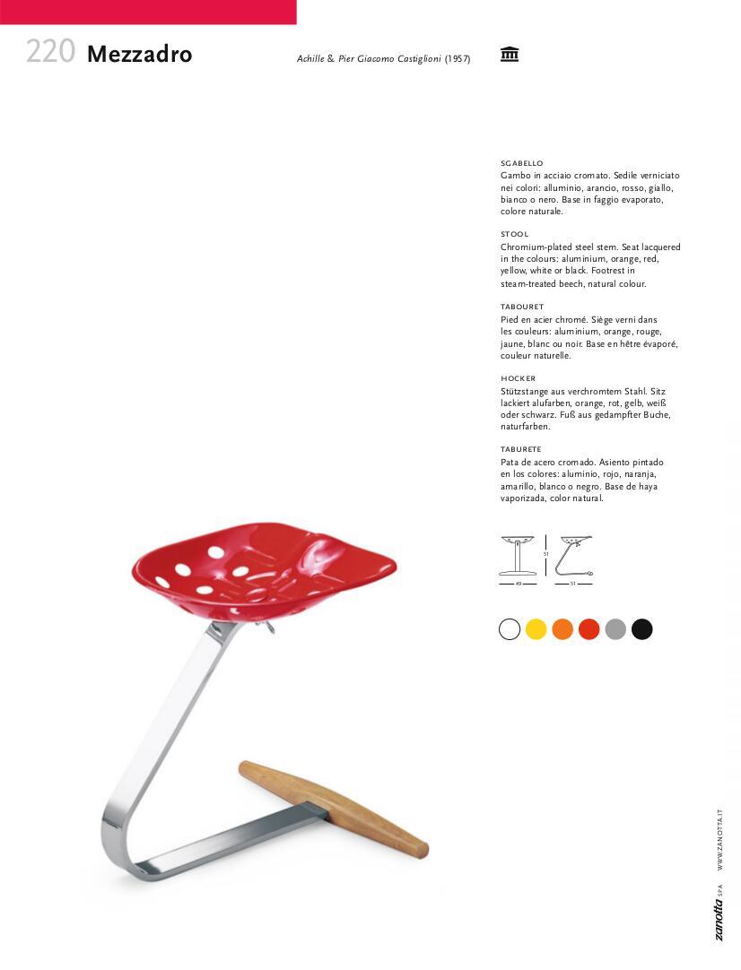 Der Hocker Mezzadro, der von Achille und Pier Giacomo Castiglioni designt wurde und von dem italienischen Möbelhersteller Zanotta produziert wird, besticht durch sein auffallend raffiniertes, industriell und rustikal anmutendes Design. Auf dem Untergestell, das aus einem Fuß aus gedampfter Buche und einer Stützstange aus verchromtem Stahl besteht, thront eine Sitzschale aus lackiertem Stahl, die in unterschiedlichen Farben erhältlich ist. Der einladende, mit Löchern versehene Sitz entspricht dem Sitz eines Fiat-Traktors, der auch heutzutage noch produziert wird. Der Mezzadro Hocker von Zanotta bringt so rustikales Industrieflair in die Wohnung und wirkt aufgrund des interessanten Materialmixes innovativ und stilvoll.