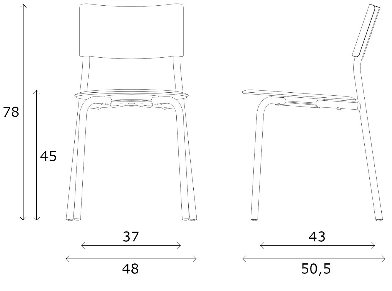 | Material | Rückenlehne und Sitzfläche aus (gebeiztem) Eichenfurnier Gestell aus pulverbeschichtetem Stahl |