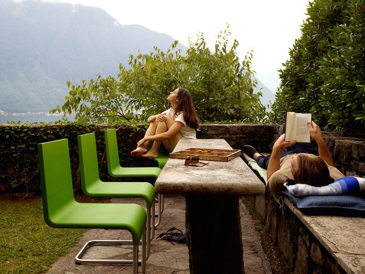 Der zeitgenössische Vitra Stuhl .05 ist auch für den Outdoorbereich geeignet
