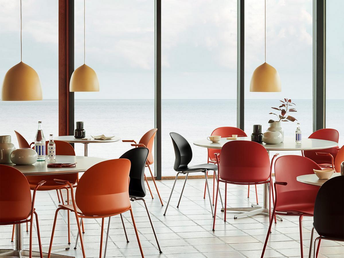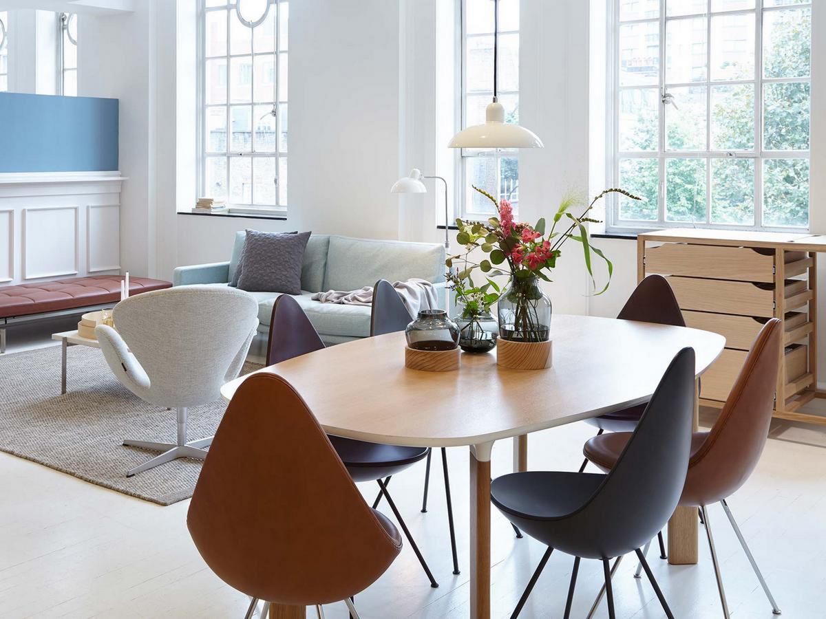 Zusammen mit dem Ei und dem Schwan entwarf Arne Jacobsen 1958 für sein Gesamtkunstwerk, das SAS Hotel in Kopenhagen, auch den Drop. Damals nur in kleiner Stückzahl für das Hotel hergestellt, wird der kleine, aber charakterstarke Stuhl seit 2014 erstmals von Fritz Hansen in Serie produziert.