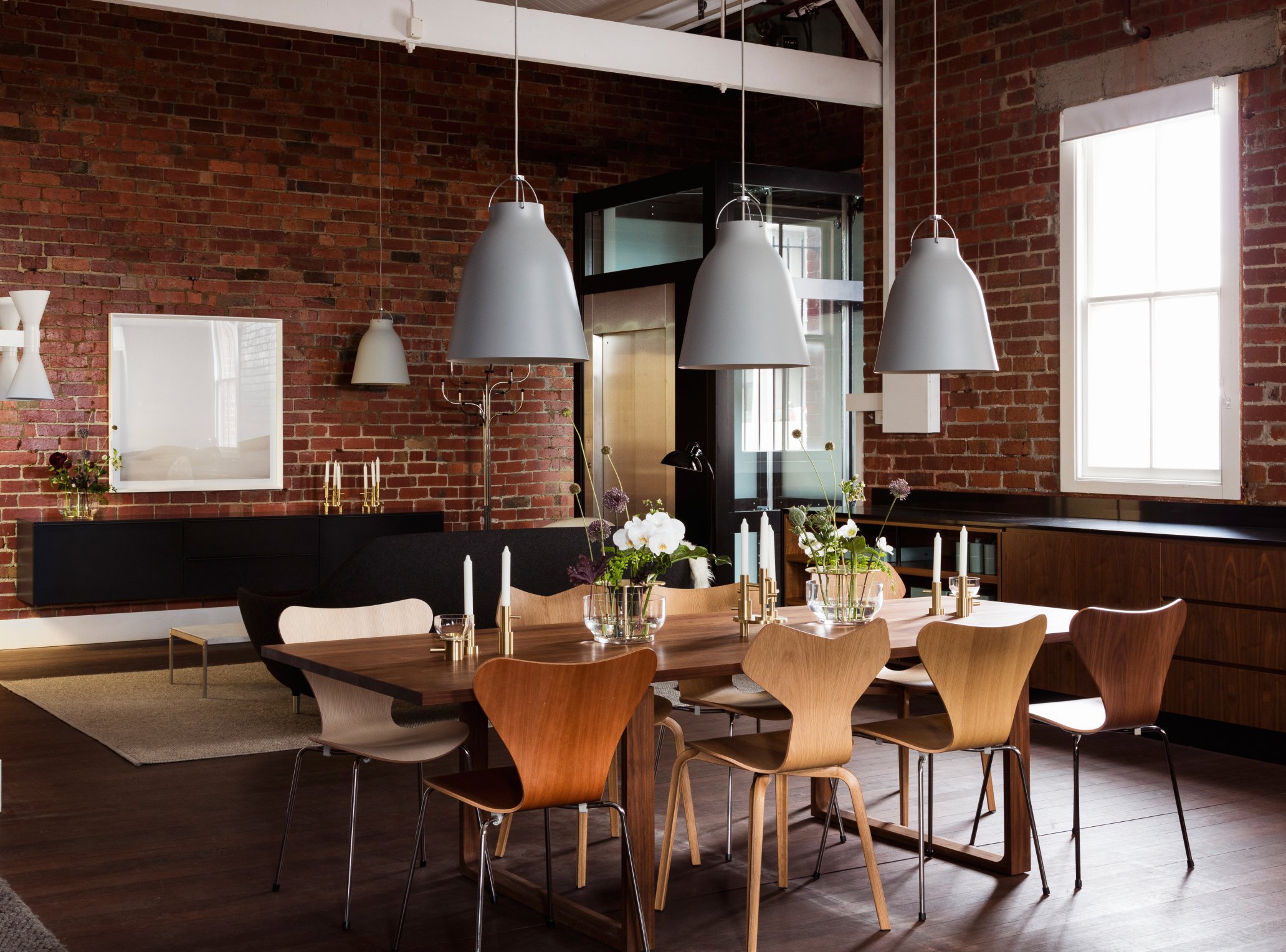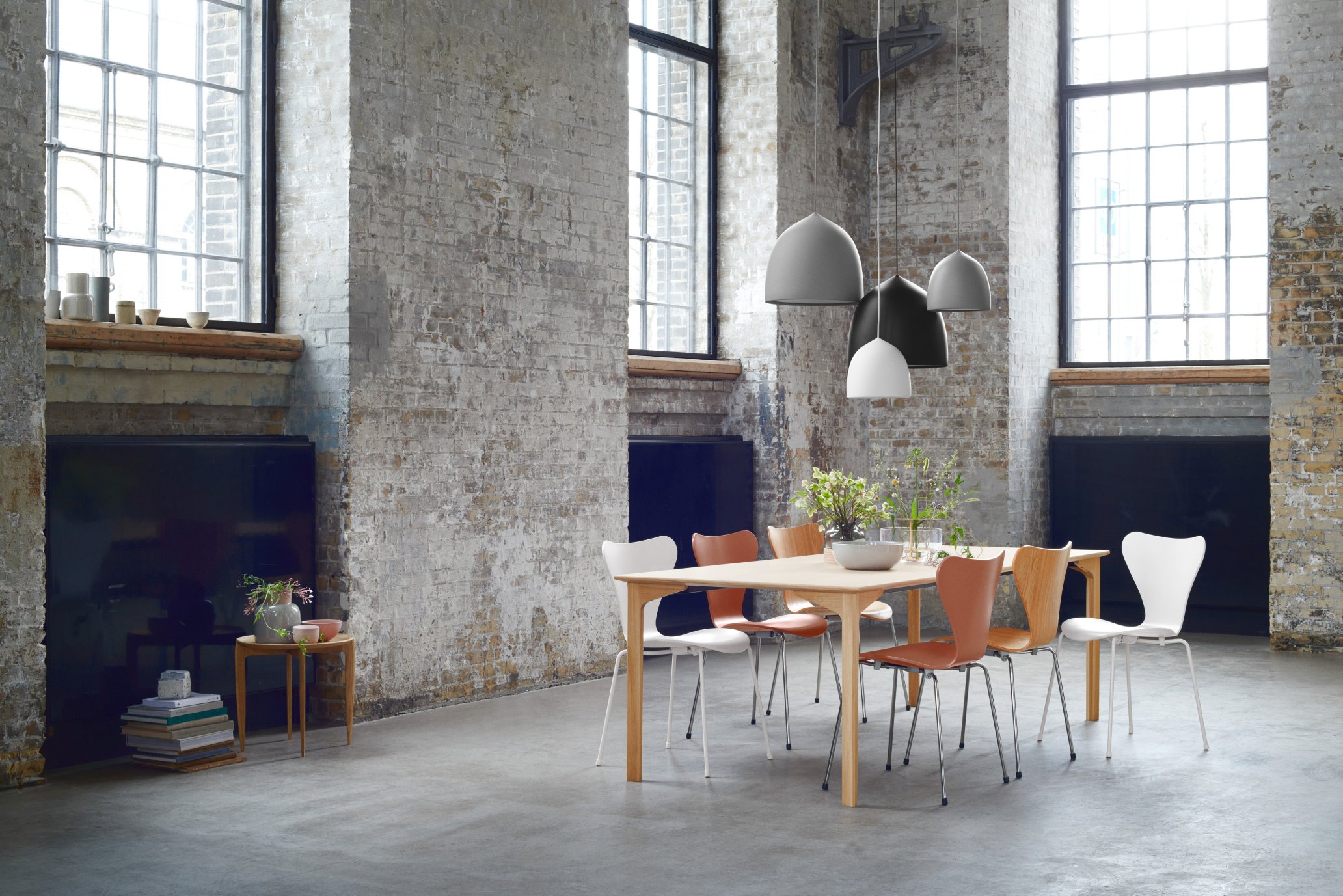 Nendos N01 Stühle, Cecilie Manz' Caravaggio Leuchte und Jacobsens Piet Hein Tisch von Fritz Hansen