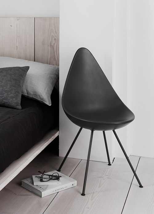 Der Drop Chair war der Lieblingsstuhl von Arne Jacobsen, da seine Frau ihn immer in Kombination mit ihrem Schminktisch nutzte. Die außergewöhnliche Form des Designstuhls brachte die Schultern und die Silhouette der Dame besonders gut zur Geltung und während sie vor ihrem Spiegel saß, konnte Jacobsen ihren Rücken bewundern und ihr gleichzeitig in die Augen schauen. Ursprünglich wurde der Drop Stuhl für die Zimmer des SAS Royal Hotels in Kopenhagen entworfen, einem Projekt, dass Arne Jacobsen in den 1950er Jahren realisierte. Heute befindet sich der Fritz Hansen Stuhl im Zimmer 606 des Hotels, dessen Interieur der original Einrichtung von damals entspricht. Der Drop Chair ist in verschiedenen Stoff- und Ledervarianten sowie mit unterschiedlichen Untergestellen erhältlich und macht sowohl als Esszimmerstuhl als auch in der Küche eine gute Figur.