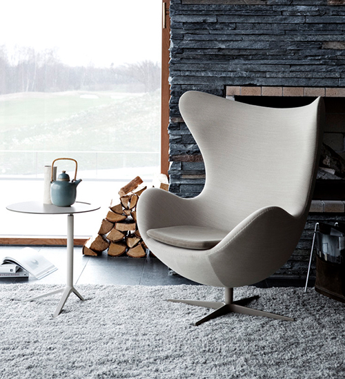 Wie zahlreiche andere Designmöbel entwarf Arne Jacobsen auch den Egg Chair ursprünglich für das SAS Royal Hotel in Kopenhagen. Der klassische Loungesessel, der seinen Namen seiner großzügigen, an ein halbes Ei erinnernden Form verdankt, wirkt mit seinem imposanten Erscheinungsbild geradezu skulptural. Die Sitzschale des Fritz Hansen Egg Chair vereint Sitz- und Rückenfläche, Kopfstütze und Armlehnen und ermöglicht es dem Nutzer, verschiedene Sitzpositionen einzunehmen und sich zudem angenehm geschützt zu fühlen. Dank der organischen Formgebung ohne harte Kanten oder Brüche in der Linienführung wirkt der Arne Jacobsen Designklassiker harmonisch und edel. Gefertigt wird das Fritz Hansen Ei aus mit Kaltschaum gepolstertem Kunststoff und ist in verschiedenen Stoff- und Ledervarianten bestellbar. Als Errgänzung zum Ei ist der passende Egg Footstool erhältlich, der dem Loungesessel zusätzlichen Komfort verleiht. Formal sind Ähnlichkeiten zu dem berühmten Swan Chair zu erkennen, einem weiteren Arne Jacobsen Sessel.