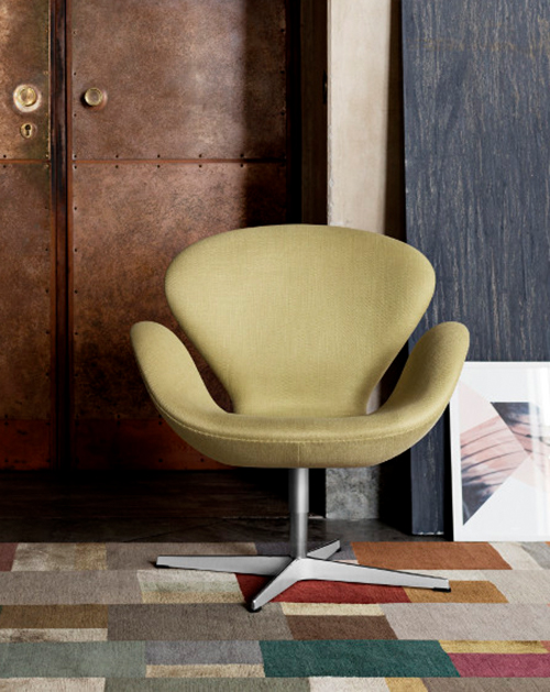 Auch der Swan Chair gehört zu der von Arne Jacobsen entworfenen original Einrichtung des SAS Royal Hotels in Kopenhagen, wo er insbesondere in der Lobby und im Business-Bereich eingesetzt wurde. Genau wie der Egg Chair überzeugt auch der Schwan mit seiner organischen, kurvigen Form und kommt ohne strenge, gerade Linien und Kanten aus. Während die großzügige Sitzschale des Fritz Hansen Designklassikers aus mit Kaltschaum gepolstertem Kunststoff besteht, wird das Untergestell aus satinpoliertem Aluminium gefertigt und bildet so einen angenehmen Materialkontrast. Als absoluter Klassiker des Skandinavischen Designs ist der Swan Chair weltweit in verschiedenen Museen vertreten, z. B. im Design Museum Dänemark in Kopenhagen, im MoMA New York und in der National Gallery of Victoria in Melbourne. Die ersten original Exemplare des Schwans werden regelmäßig von renommierten Kunstauktionshäusern versteigert. Im Rahmen der Documenta III im Jahr 1964 wurde der Fritz Hansen Sessel gemeinsam mit anderen Arbeiten Arne Jacobsens im Bereich Industriedesign ausgestellt. Bis heute schmückt das legendäre Designmöbel bedeutsame Institutionen im öffentlichen Raum und ist regelmäßig in Filmen zu sehen.