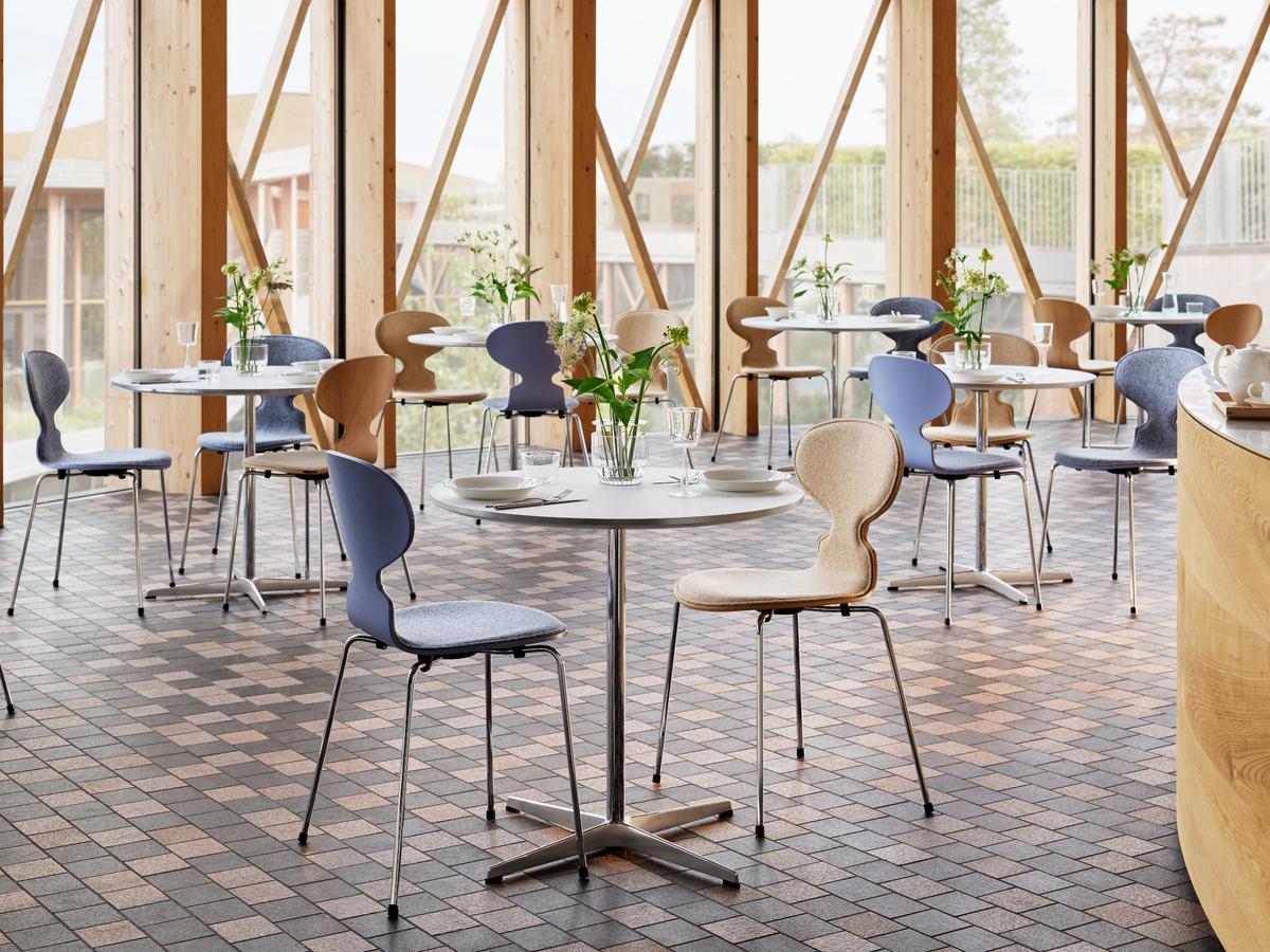 Der Stuhl Ameise wurde 1952 von Arne Jacobsen entworfen und seither von Fritz Hansen als echter Designklassiker produziert. Seine minimalistische, elegante Anmutung verdankt der an eine Ameise erinnernde Stuhl der Sitzschale, die aus einem einzigen Stück gebogenem Furniersperrholz gefertigt wird. Sein komfortables Frontpolster zieht sich über die gesamte Sitz- und Rückenfläche.