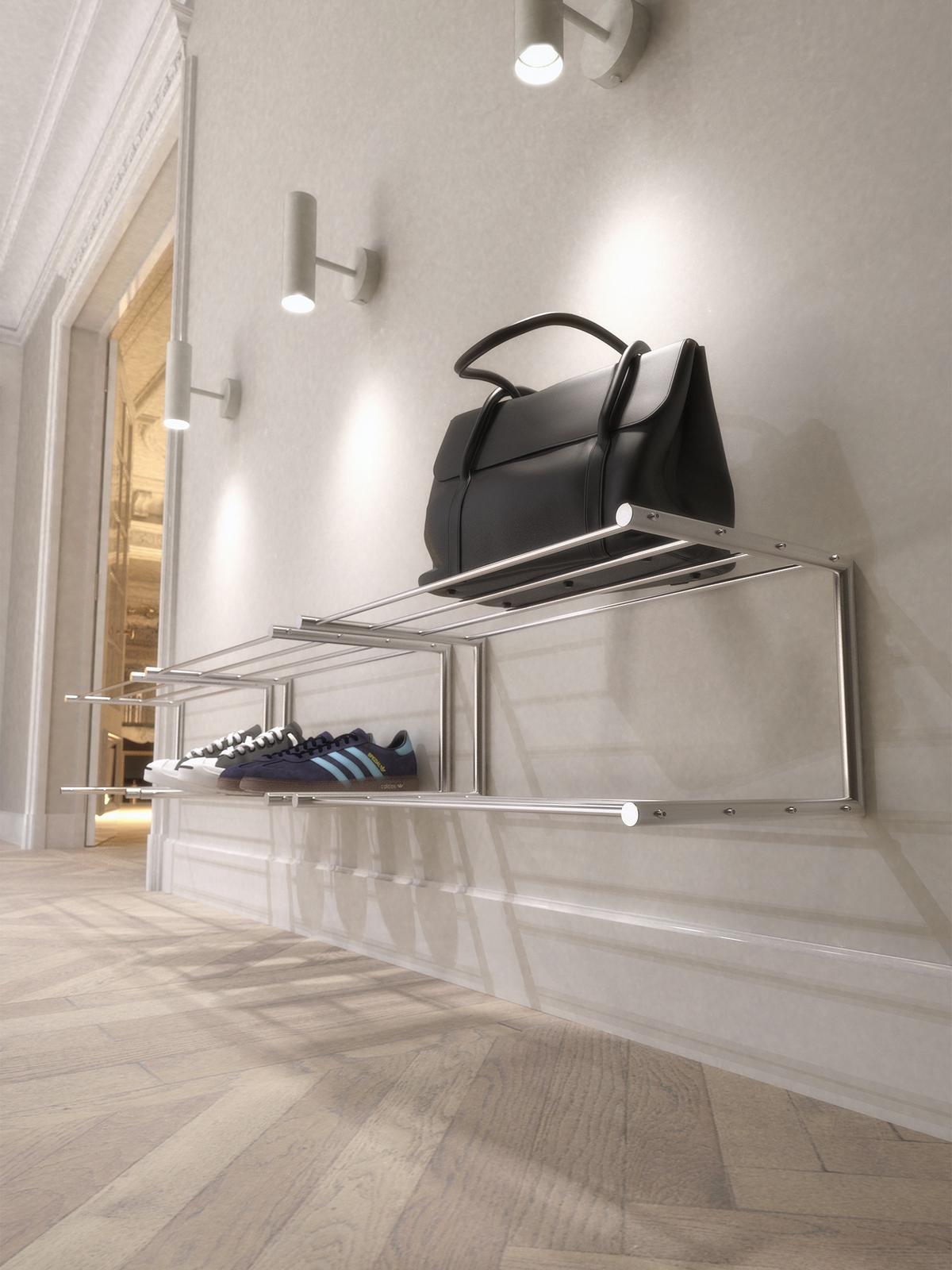 Zur Kollektion NOVA gehören klassische Accessoires für die Gestaltung von Badezimmern und Garderoben, wie die Nova Schuhablage oder der Nova Table Desinfektionsspender.